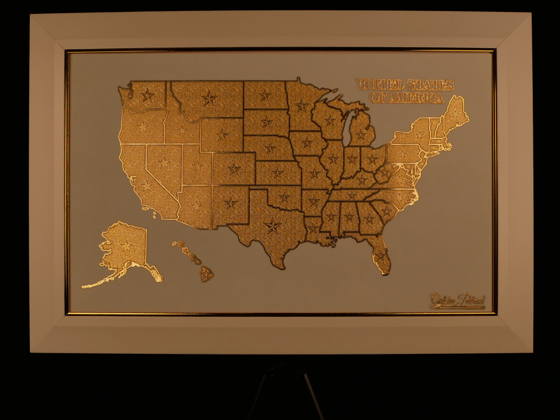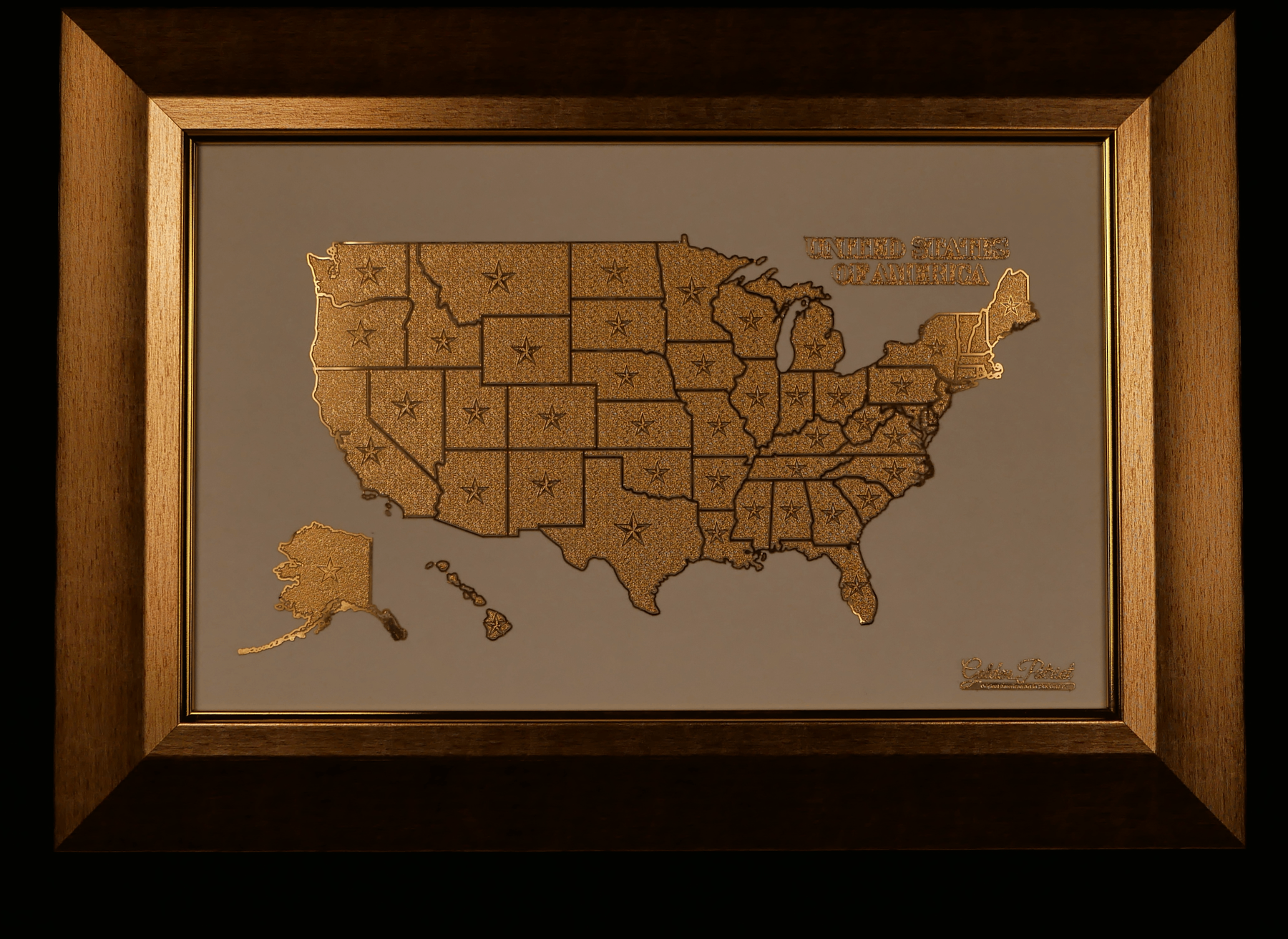 Experience the beauty, unity, and grandeur of the United States with Golden States, one of our most cherished and breathtaking 24K gold masterpieces. This original design showcases a meticulously crafted map of the USA, where each state is elegantly represented by a shimmering star, symbolizing the strength and individuality of every part of this great nation.
