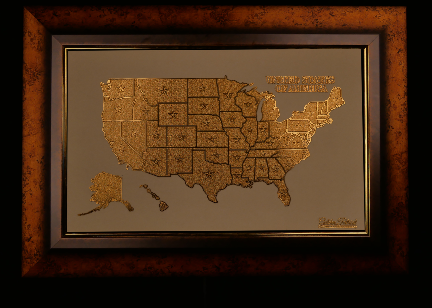 More than just a work of art, Golden States is a testament to the unparalleled artistry and craftsmanship of Golden Patriot. Every intricate detail is carefully sculpted and flawlessly gold-plated, bringing this map to life with a radiant brilliance that captivates the eye and inspires the heart. Whether displayed in a home, office, or prestigious collection, this masterpiece serves as a powerful symbol of American pride, unity, and perseverance.